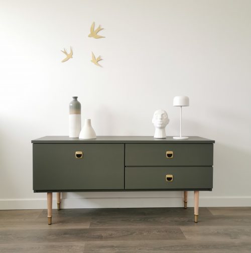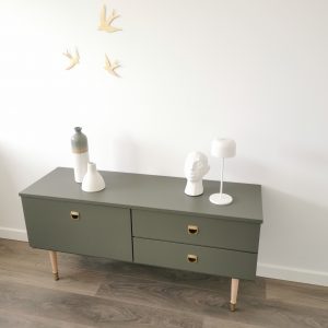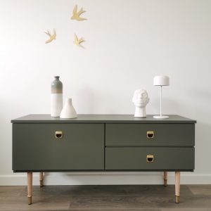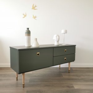 Coiffeuse des années 70 proposée en enfilade basse dans une teinte profonde vert gris foncé. Pieds remis au naturel et recouverts d’un vernis de protection mat incolore. Intérieurs abattant et fonds de tiroirs peints dans un blanc lin. Fond du meuble et charnière abattant changés. Poignées et embouts pieds dorés d’origine. Rénovation soignée pour ce meuble qui mérite une jolie nouvelle vie!
